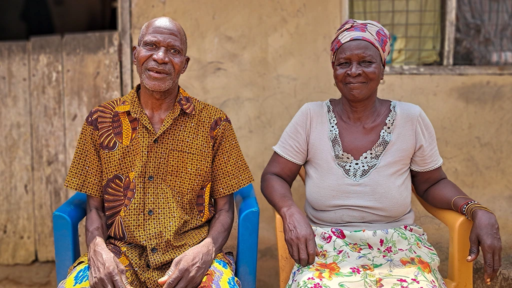 Ayetu and his wife, Adwoa, sit in front of their home in Adawukwa Fianko, Ghana. The 84-year-old was at risk of losing his sight entirely because he couldn’t afford the medication he needed to manage glaucoma. Thanks to our program, he is now getting the eye drops he needs to manage the condition – free of charge.
