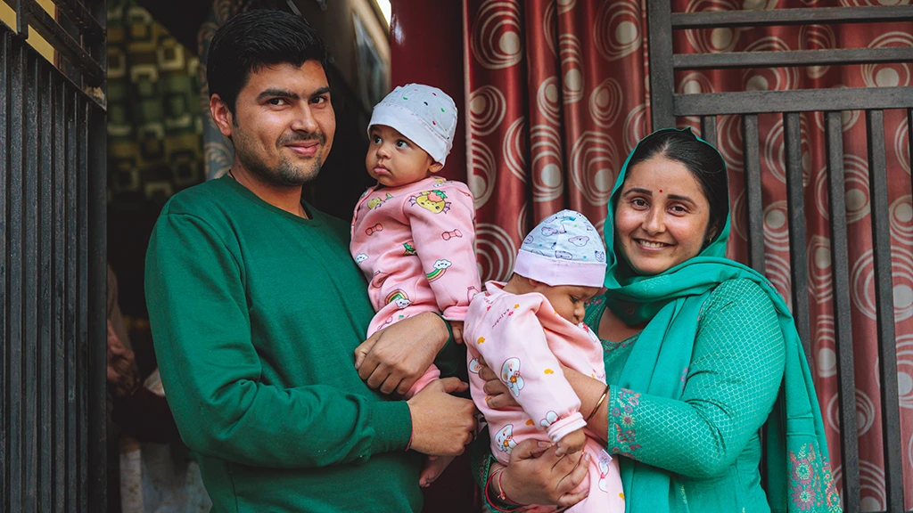 Ayan and Vyan with their father, Vinit, and mother, Anchal, in January 2023. The twin baby girls were diagnosed and treated for Retinopathy of Prematurity at our partner hospital, the C. L. Gupta Eye Institute.