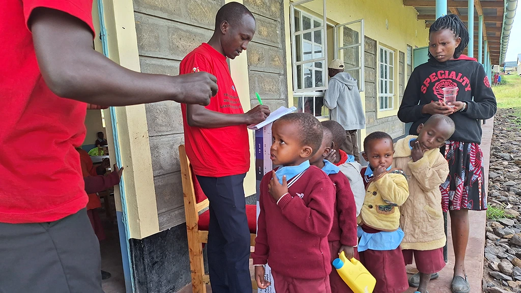 Children line up to receive a dose of trachoma-preventing antibiotics during a Mass Drug Administration event in Narok County, Kenya in January 2024.