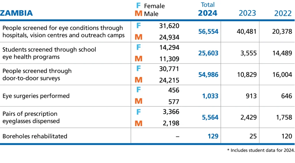 Our disease control programs saw us screen 40 per cent more people through hospitals, vision centres and outreach camps than in 2023. We also dispensed more eyeglasses than in 2023, due to school eye health programs in Lusaka, Mkushi and Kapiri Mposhi. We provided access to clean water to 59,406 people in Kapiri Mposhi and 70,420 in Mkushi by rehabilitating 129 boreholes at schools, health centres and community water points.